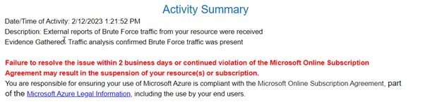 The alerts indicated that a bad actor had gained access to my VMs via RDP, escalated their role and performed some brute force attacks using my resources (which is a gross violation according to Microsoft safety usage policy)