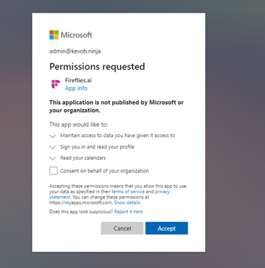 Some generative AI models application require user or admin consent to be used in the organization. You probably have seen this where you join a meeting and notice some AI models in the meeting taking notes. As mentioned earlier, we should be concerned about the compliance state of these models since we are granting them access to company sensitive information. These models are granted permissions by a user or administrator as shown below.