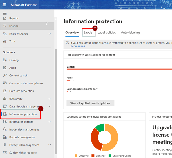 - Visit Microsoft Purview compliance portal and select Information Protection under the solutions and click on labels