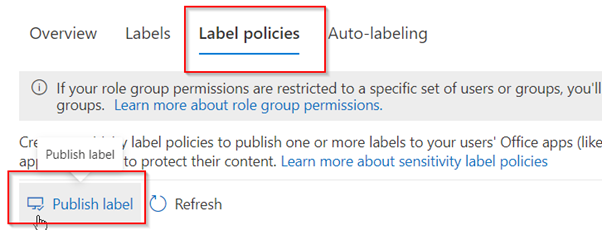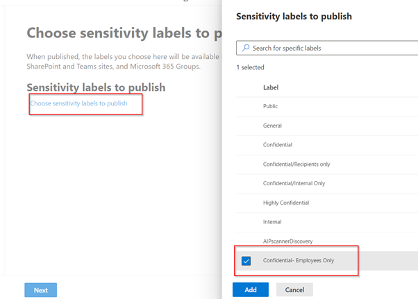 Then click choose sensitivity labels to publish and select the label that we want to publish