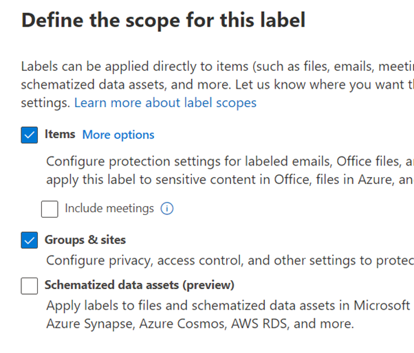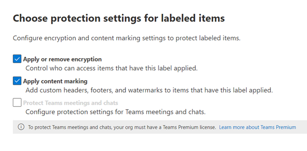 - Under choose protection settings, tick the first two options as seen below. This will allow us to configure encryption for the label and also apply content marking to documents that will have this label applied to