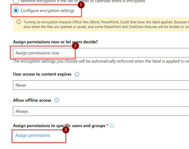 - On the encryption, select Configure encryption settings and click on assign permissions now then select assign permission to define the encryption that we want for the document.