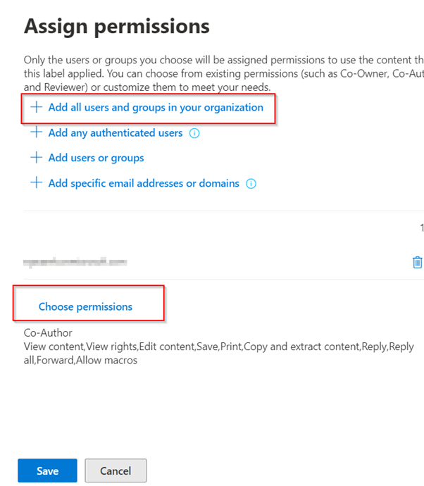 This will take you to the page below to configure the encryption. Here we will select add all users and groups in your organization with the option of selecting the permission we might want them to have. This means that only the people who are part of our organization will be able to open a document or email that contains this sensitivity label.