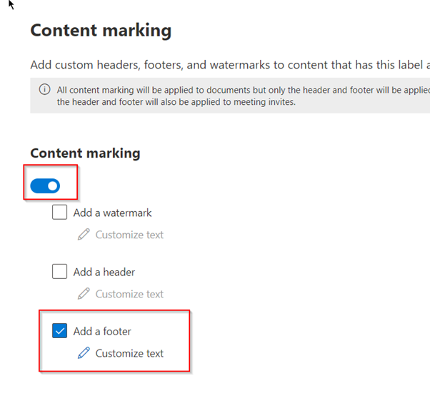 - Under the content marking, turn on the content marking option and tick the add a footer option to configure a footer that you desire