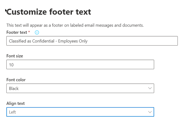 Click the customize text and fill in with the required details. This is settings configures the footer that will be visible to documents and emails when the label is applied.