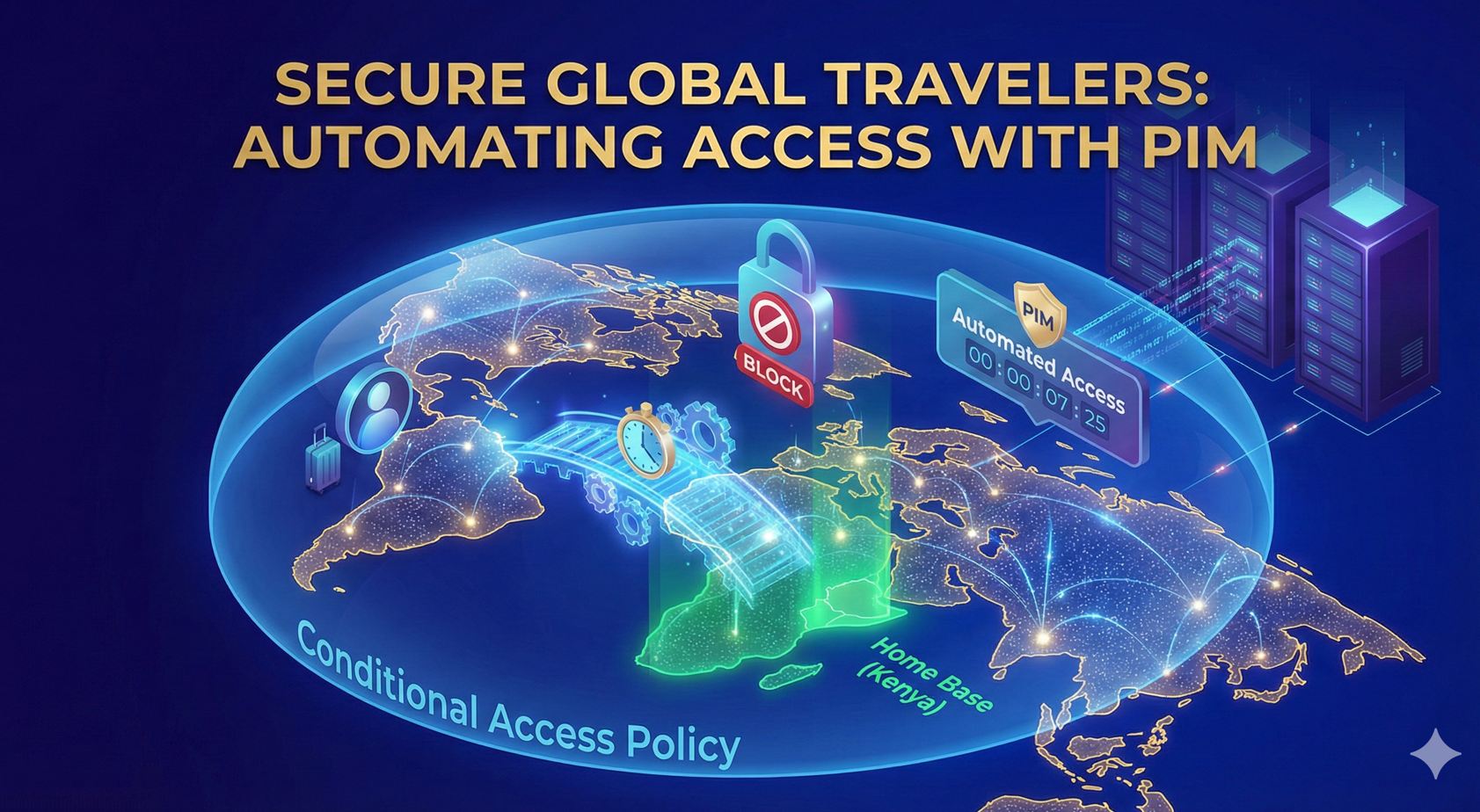 By using Privileged Identity Management (PIM) for Groups, admins can retain full responsibility for the security posture while eliminating the risk of human error. We can “schedule” a user’s exclusion to start the moment their flight takes off and end the moment they land back home—automatically. This meas that for instance if our employees are only allowed to login from Kenya, then our user here plans to travel to Dubai Tomorrow and return after two weeks; by default the conditional access policy in place will block that, but since the employee has communicated about their travel plans; we will create a time bound assignment to a group membership that is excluded from the policy such that the assignment will activate automatically on the date that the empoyee will travel and deactivate automatically on the return date provided.